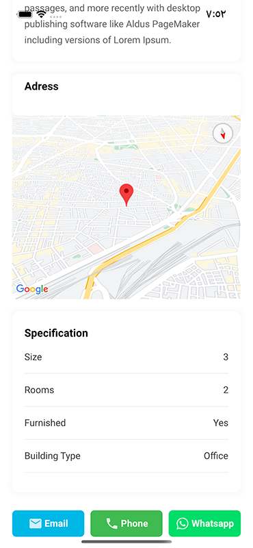 The information-rich and fully-featured listing details page in Lara Flutter app leaves no stone unturned. From a captivating photo gallery to comprehensive listing features, description, pricing, maps, and precise location details, this page provides users with all the essential modern widgets for an immersive and informed experience.